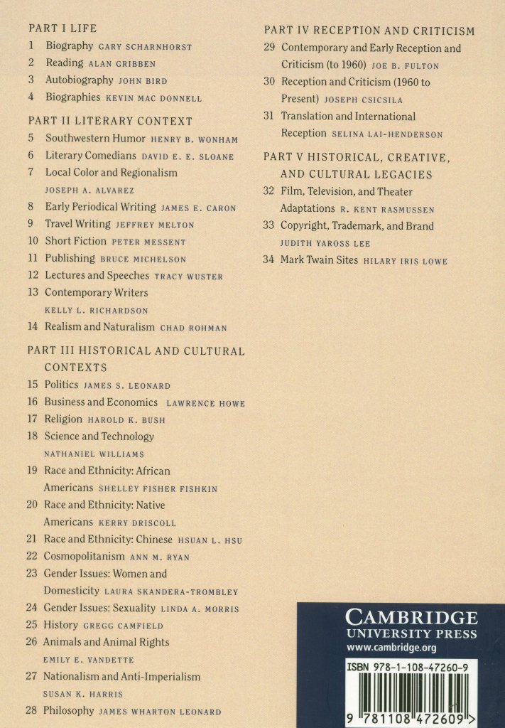 John Bird, a founding editor of The Mark Twain Annual and current author of the yearly Mark Twain chapter in American Literary Scholarship, here assembled thirty-four Twain scholars qualified to comment on five aspects of his complex carer: biography, literary contexts within which he wrote, historical and cultural contexts of his time, reception and criticism he and his works encountered, and the extent of his various legacies. Alan Gribben contributed “Reading” in Part I: Life.